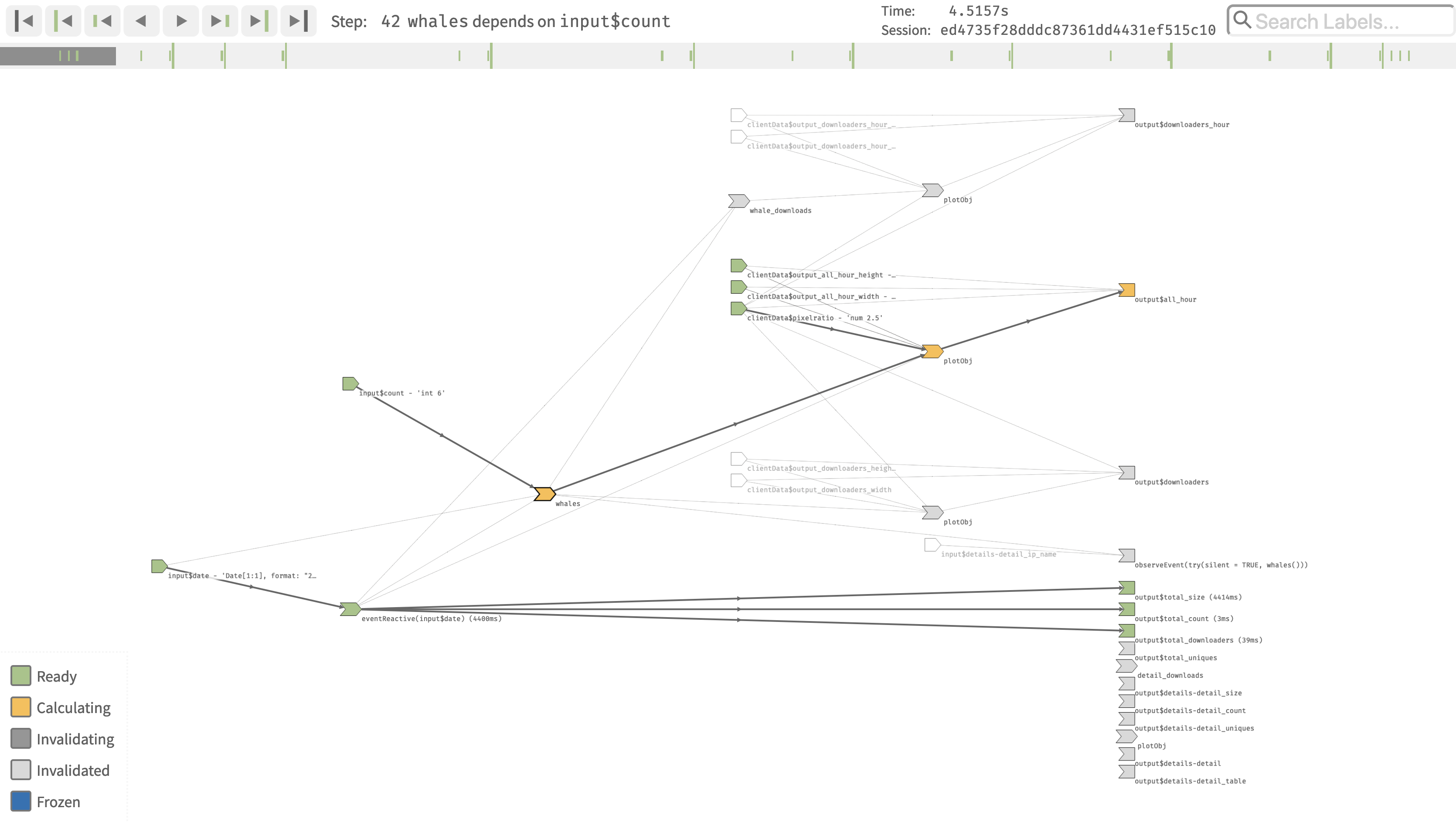 Information about the current step appears above the progress bar and provides information about the current state of the reactive graph formation. The step description makes a direct reference to stages of the The reactive life cycle. The time information displays the relative time difference between the current step and from the first recorded step.2 The Session will display the Shiny session ID that the current step is being executed in. The session ID can potentially be of interest if your shiny app is serving multiple users.