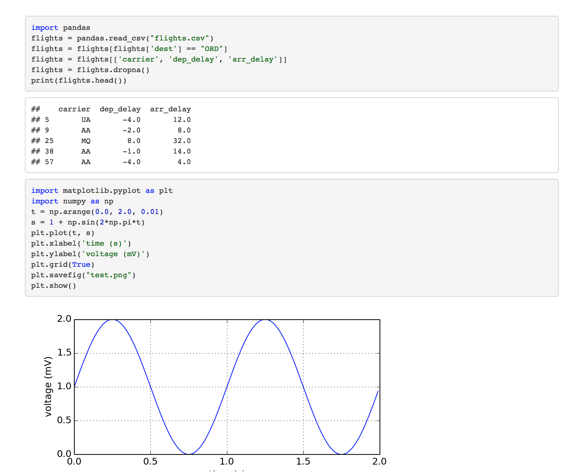 Python code chunks work exactly like R code chunks: Python code is executed and any print or graphical (matplotlib) output is included within the document.