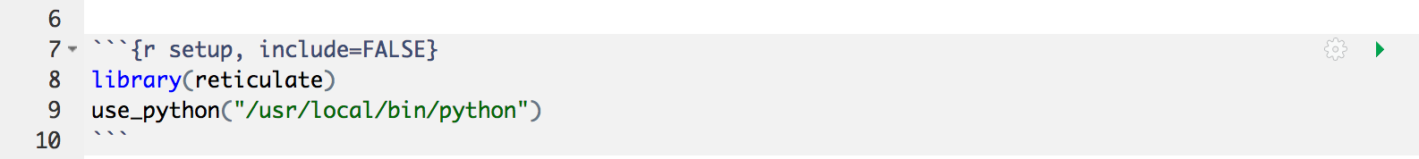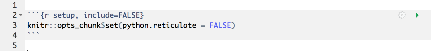 If you are using knitr version 1.18 or higher, then the reticulate Python engine will be enabled by default whenever reticulate is installed and no further setup is required. If you are running an earlier version of knitr or want to disable the use of the reticulate engine see the Engine Setup section below.