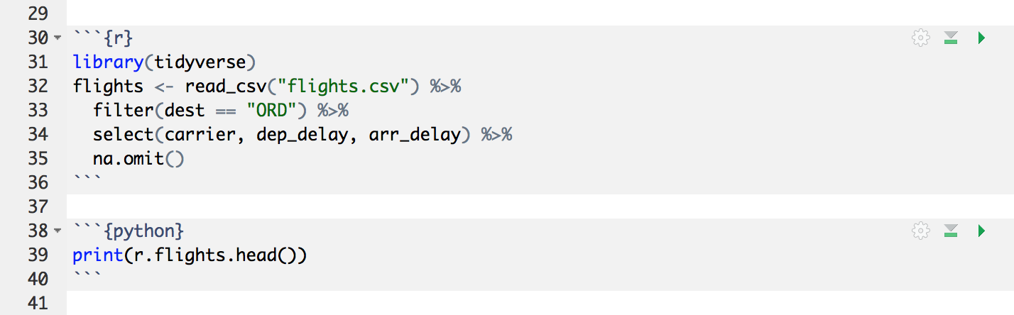 Python chunks behave very similar to R chunks (including graphical output from matplotlib) and the two languages have full access each other’s objects. Built in conversion for many Python object types is provided, including NumPy arrays and Pandas data frames.