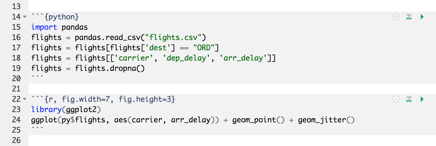 ggplot(flights, aes(carrier, arr_delay)) + geom_point() + geom_jitter()See the source_python() documentation for additional details on sourcing Python code.