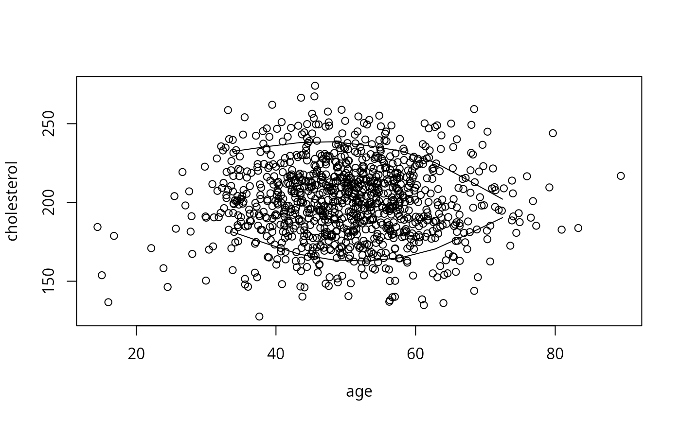 plot(age, cholesterol) # show bivariate data density and perimeter