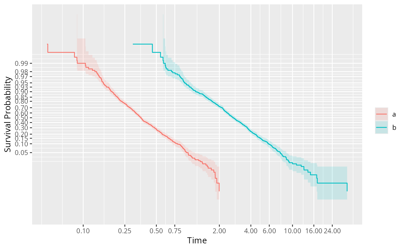 the name of a transformation for the survival probabilities to use in drawing the y-axis scale. The default is no transformation, and other choices are "logit", "probit", "loglog". "loglog" represents \(-log(-log(S(t)))\)