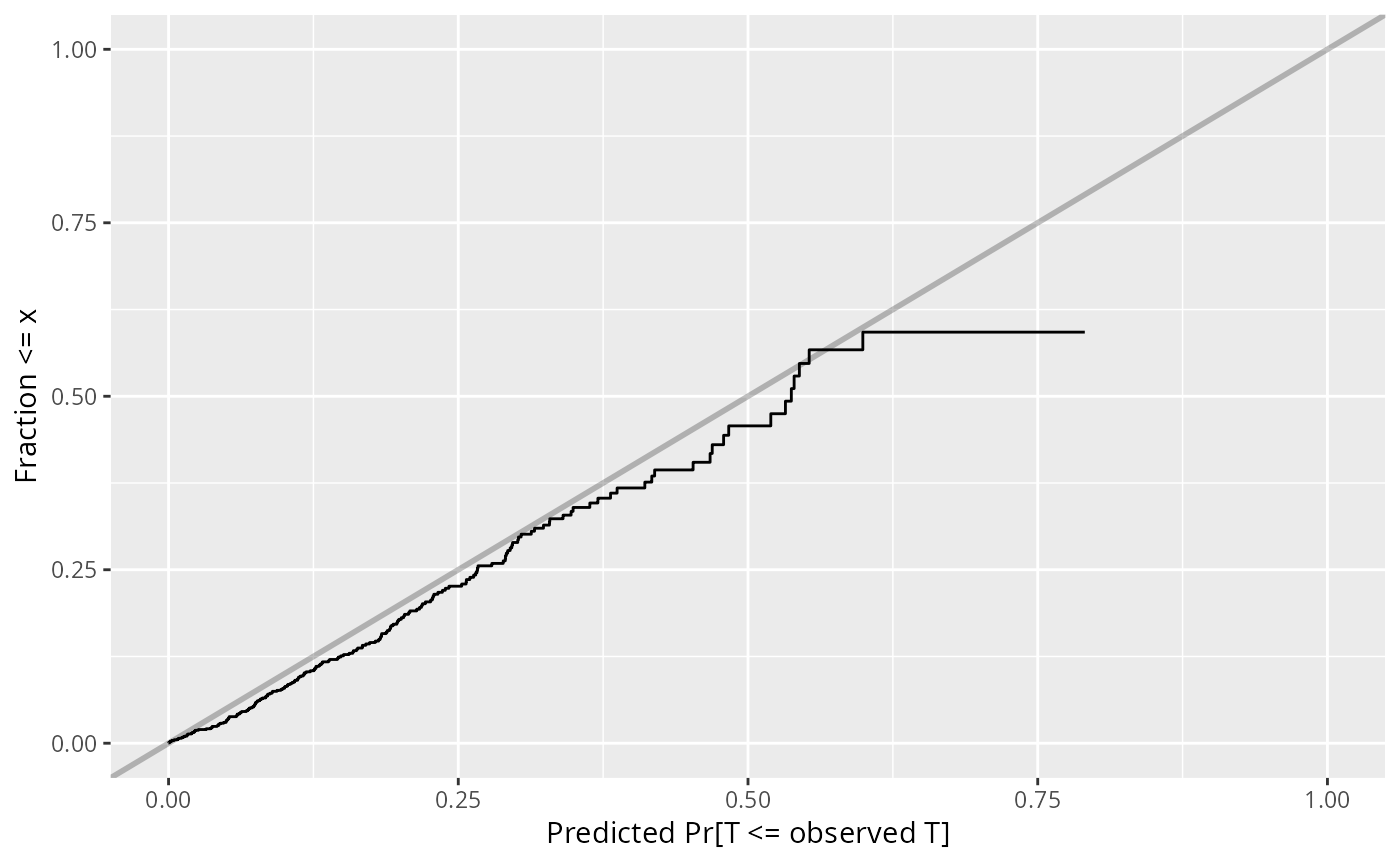 # compare the predicted Pr[T <= observed T | T>c, X] to