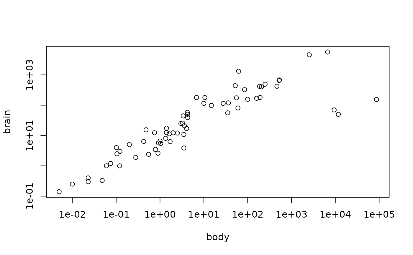 plot(log(brain) ~ log(body), data = bbdat, main = d.name)