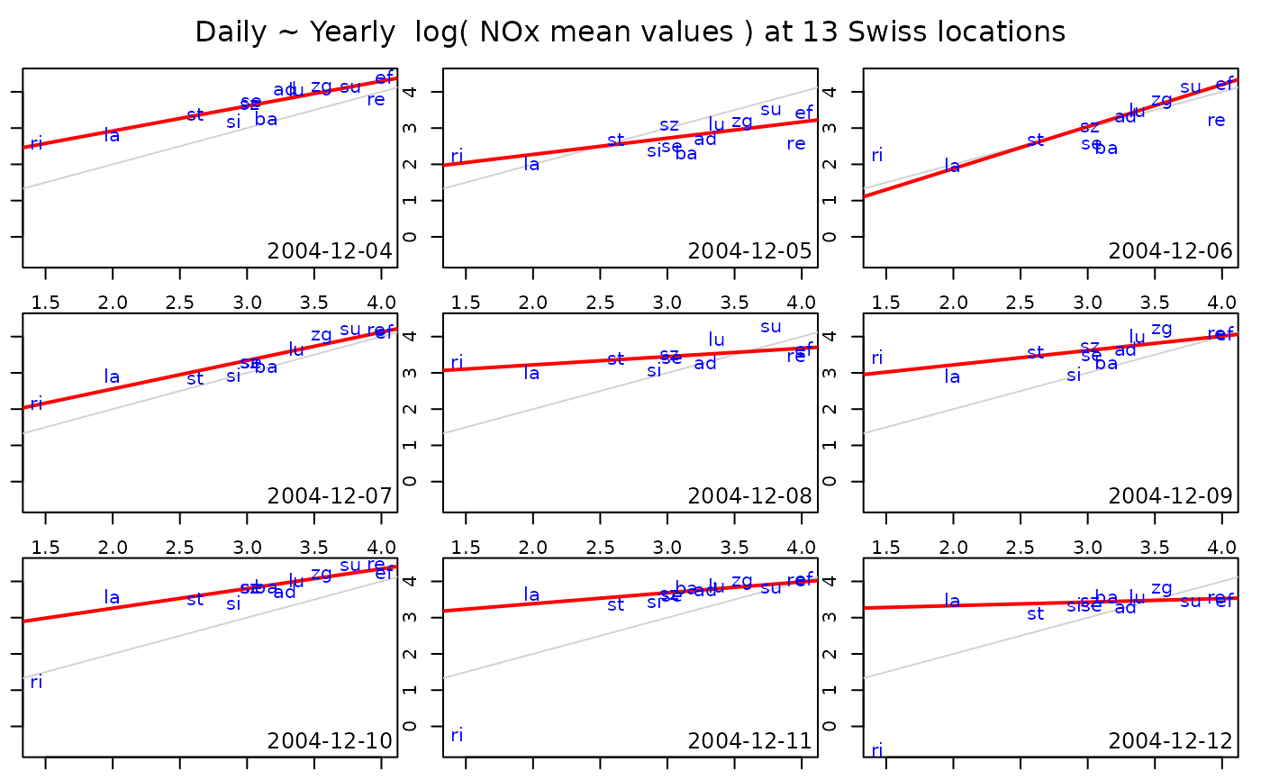 mtext("Daily ~ Yearly log( NOx mean values ) at 13 Swiss locations",