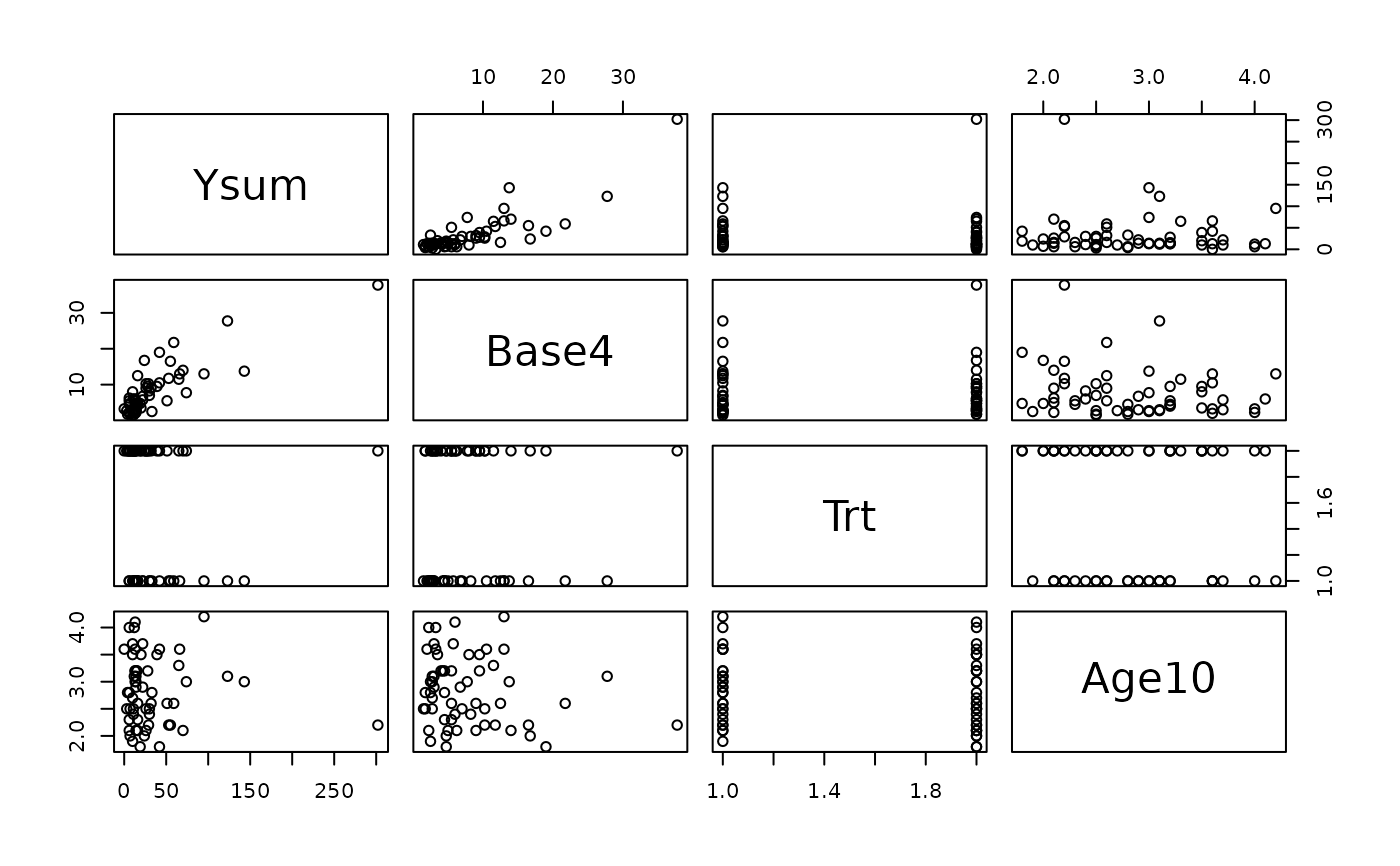 pairs(epilepsy[,c("Ysum","Base4","Trt","Age10")])