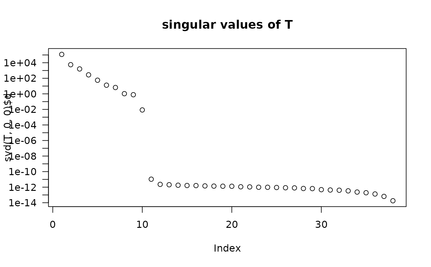 plot(svd(T, 0,0)$d, log="y", main = "singular values of T", yaxt="n")