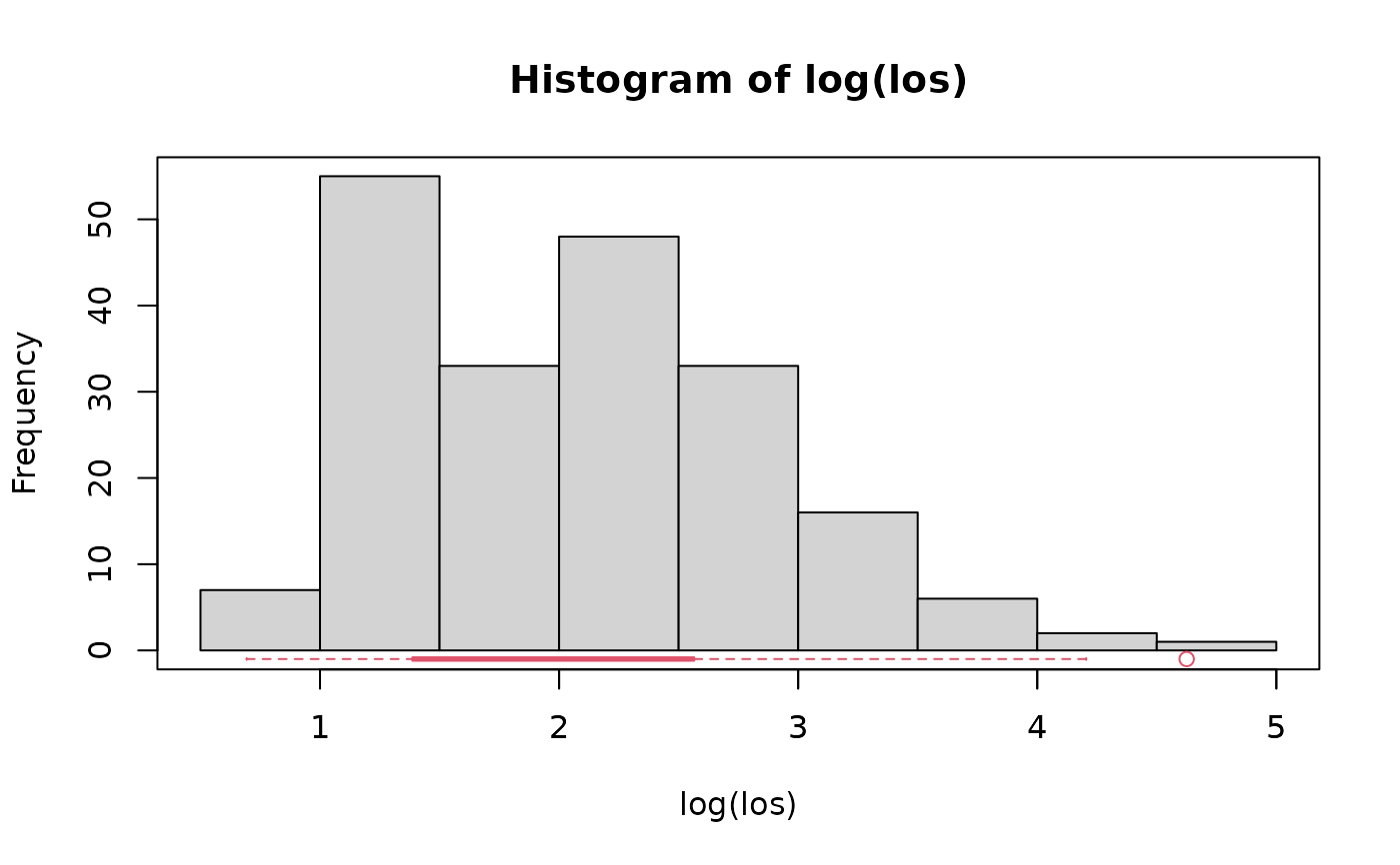 boxplot(log(los), add=TRUE, col=2, border=2, horizontal = TRUE, at = -1)