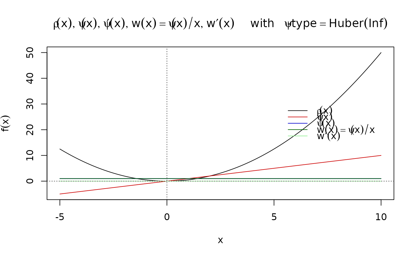 cPsi <- psiFunc(rho = function(x,.) x^2 / 2, psi = function(x, .) x,