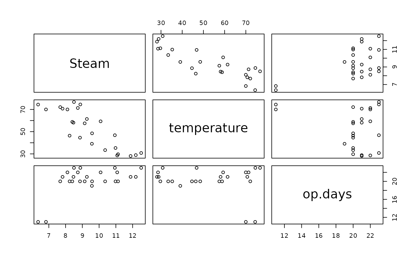pairs(Steam ~ temperature+op.days, steamUse)