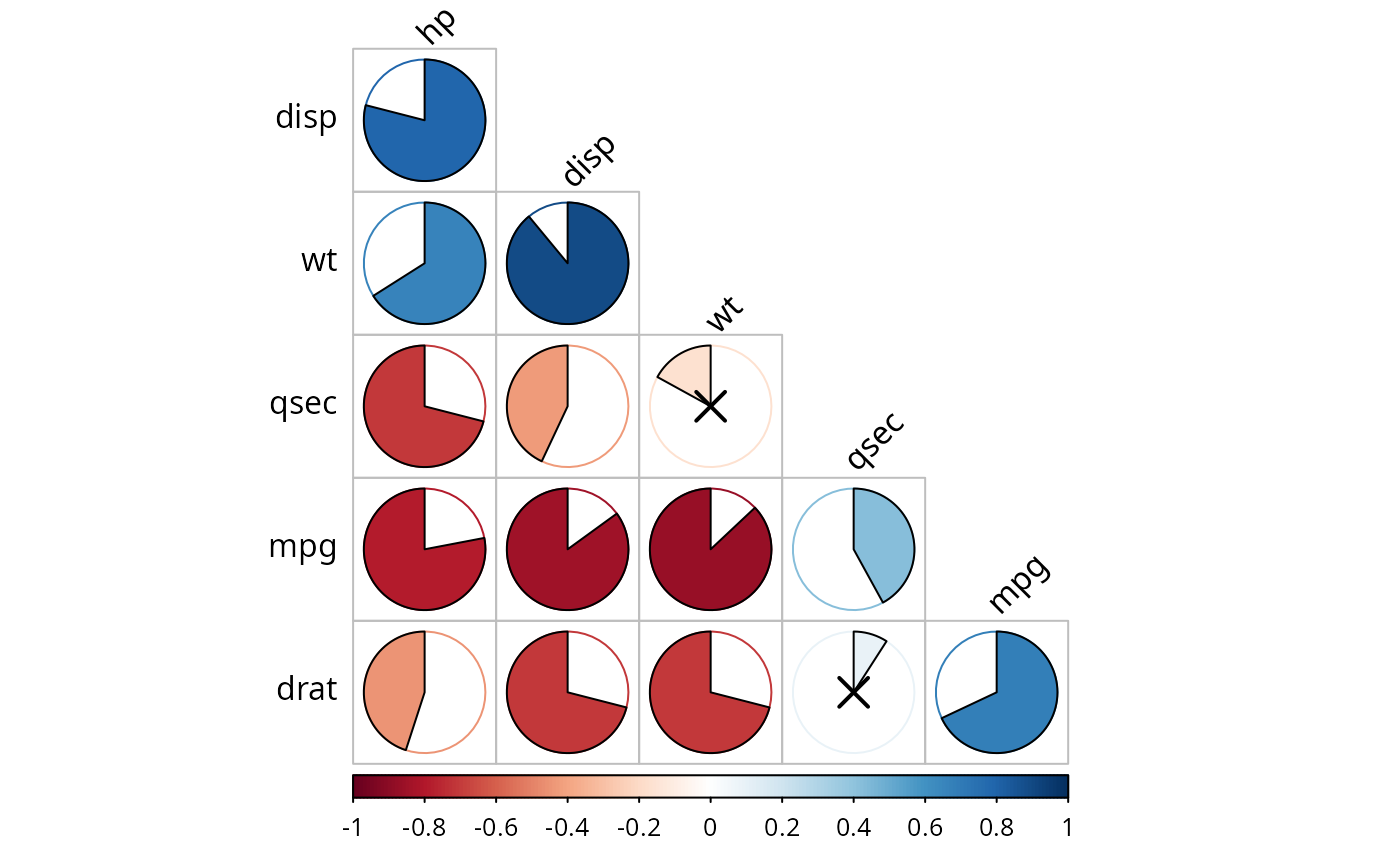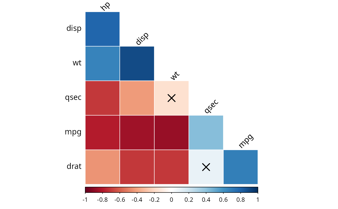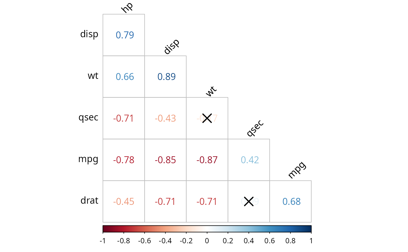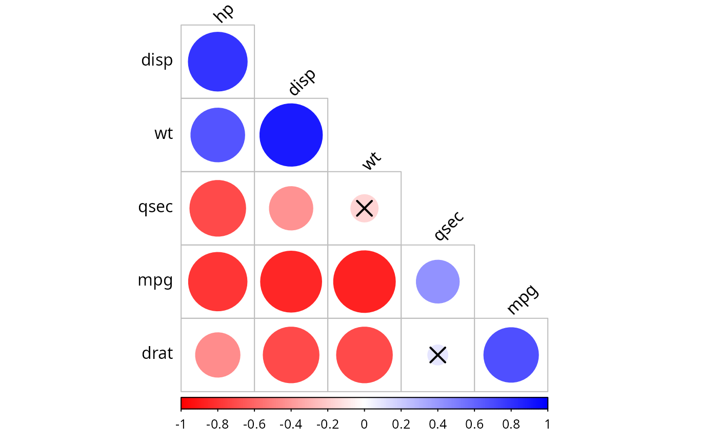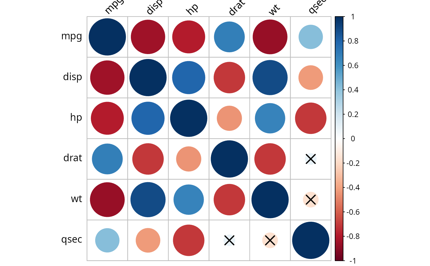 character, specialized insignificant correlation coefficients, "cross" (default), "blank". If "blank", wipe away the corresponding glyphs; if "cross", add crosses (X) on corresponding glyphs.