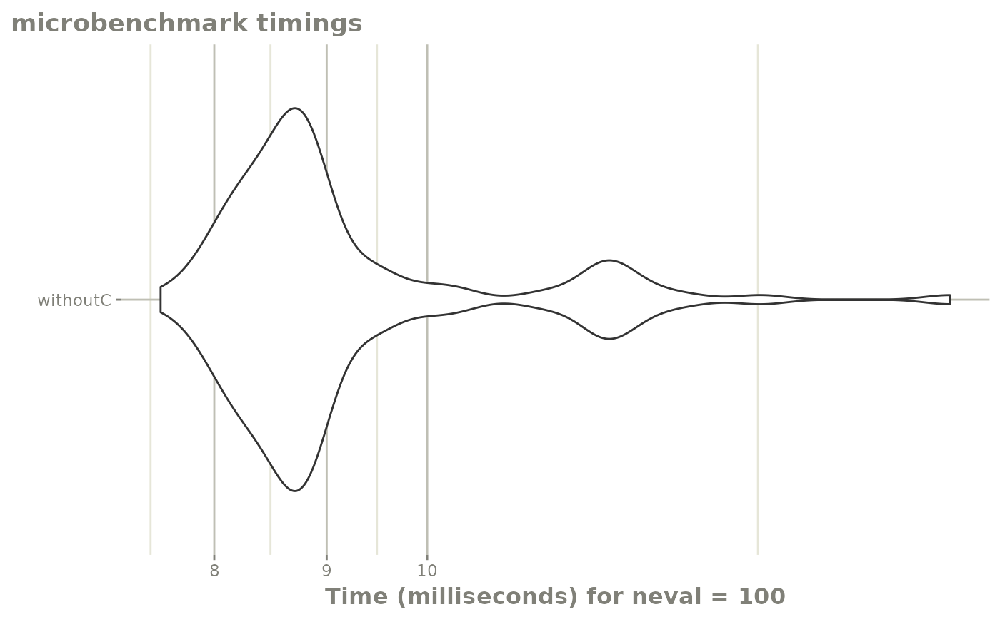 #> withC 2.807305 2.962884 3.196490 3.058206 3.369417 8.022814 100The C version is almost twice as fast as the R version. You may have