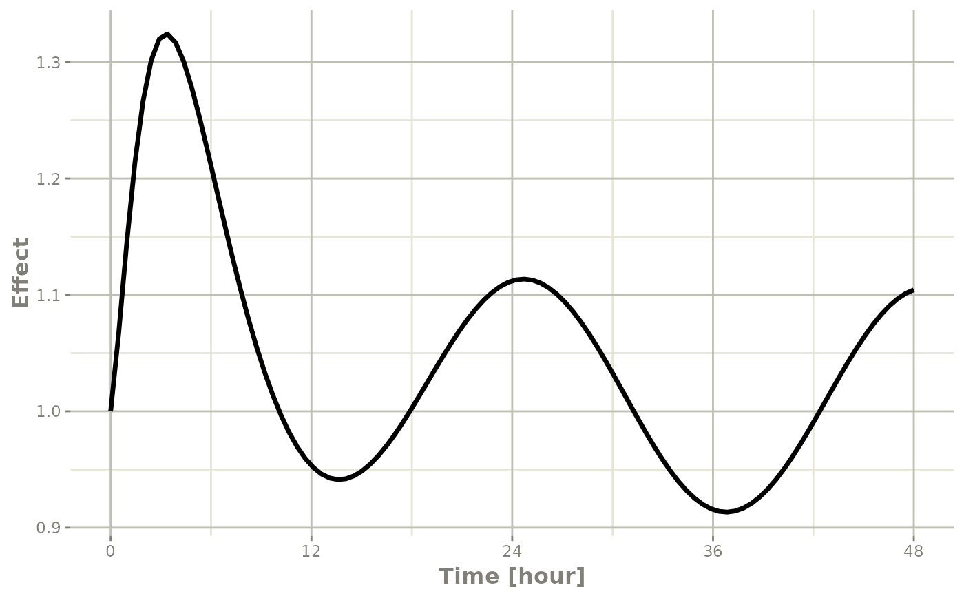 Note that the linear approximation in this case leads to some kinks in the solved system at 24-hours where the covariate has a linear interpolation between near 24 and near 0. While linear seems reasonable, cases like clock time make other interpolation methods more attractive.