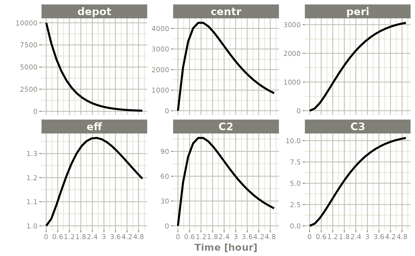 rxode2 supports returning a solved object that is a modified data-frame. This is done by the predict(), solve(), or rxSolve() methods.