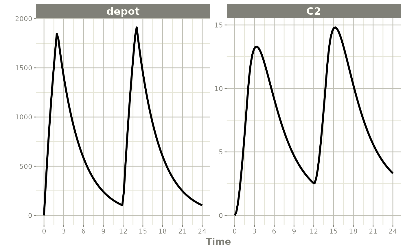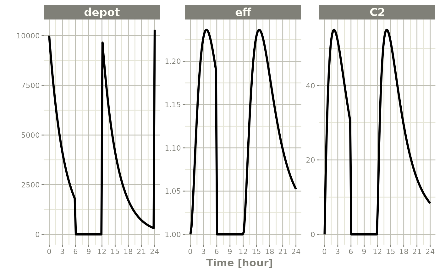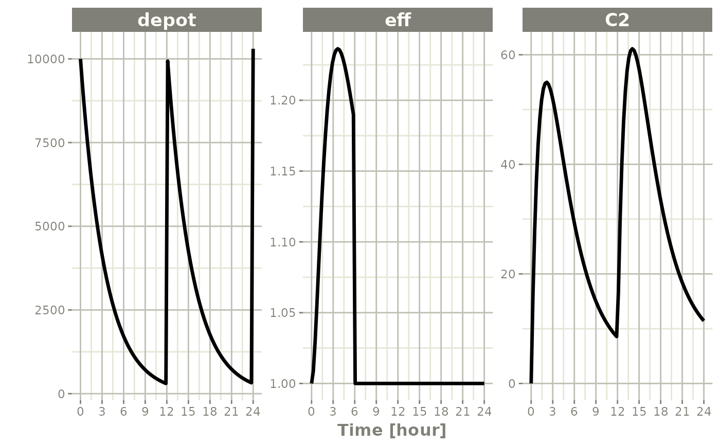rxSolve(m1, ev) %>% plot(depot,C2, eff)#> i parameter labels from comments are typically ignored in non-interactive mode