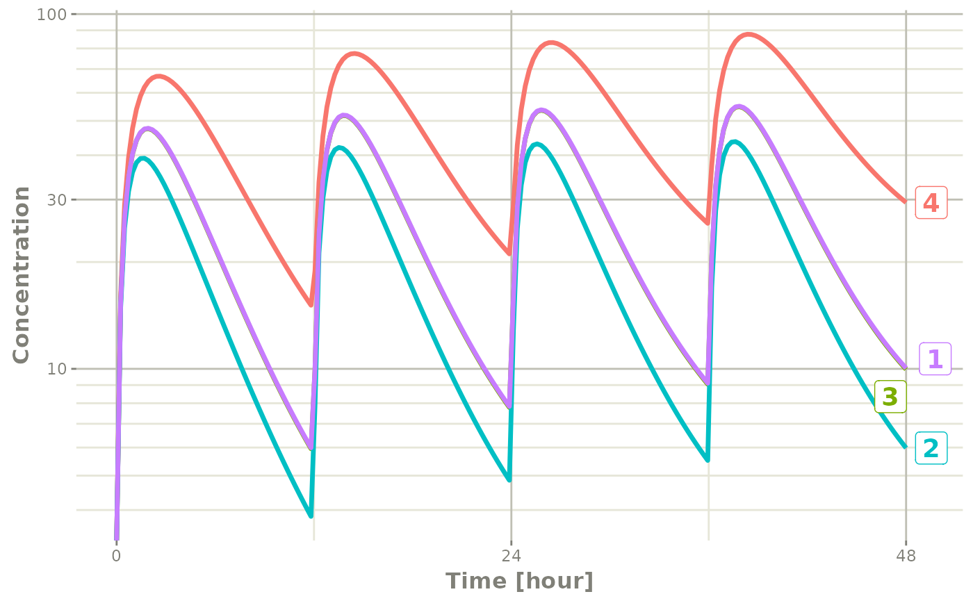 If you have multi-subject plots you can easily plot applying the same principles as above. To illustrate this plot, lets expand an event table to include a plot of 4 subjects with lognormal random variability between subjects;