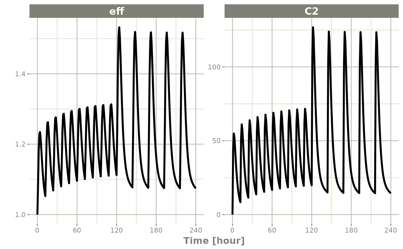 parameters($params) as well as in the actual dataset.The first obvious difference is in speed; With multiple subjects you can run each subject ID in parallel. For more information and examples of the speed gains with multiple subject solving see the Speeding up rxode2 vignette.