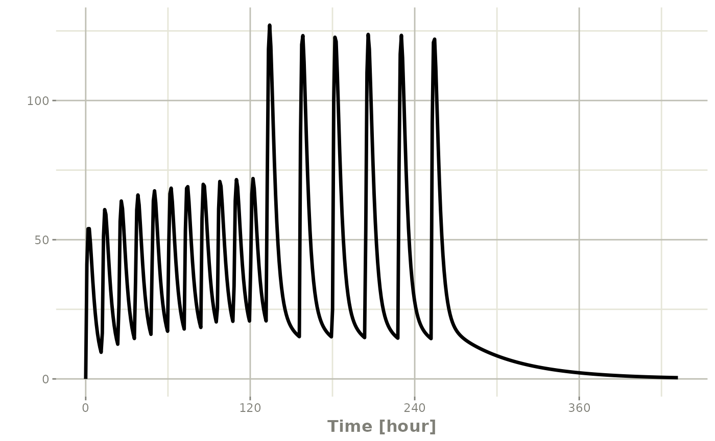 ev$add.dosing(dose=10000, nbr.doses = 3)# loading doses