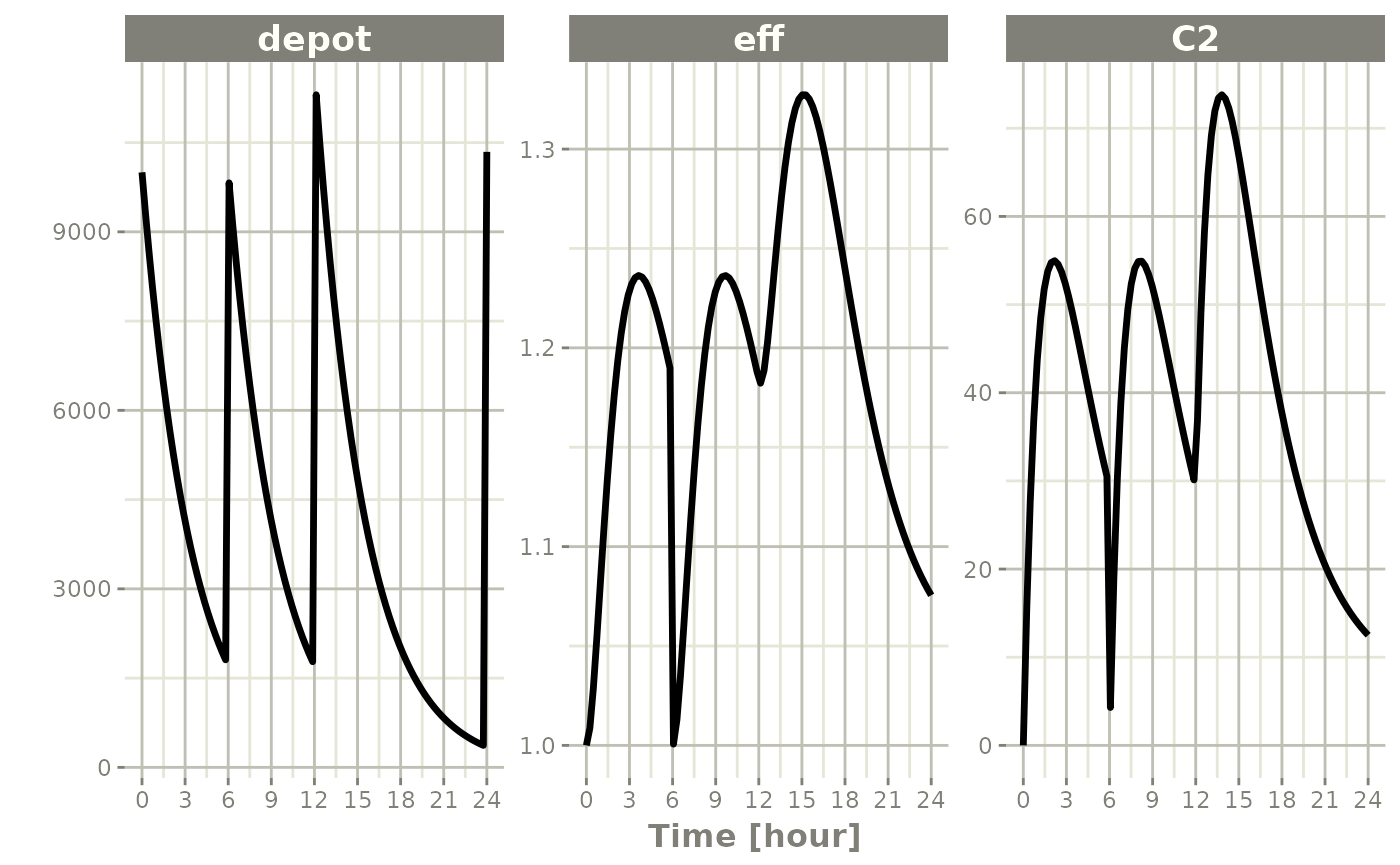 rxSolve(m1, ev) %>% plot(depot,C2, eff)#> i parameter labels from comments are typically ignored in non-interactive mode