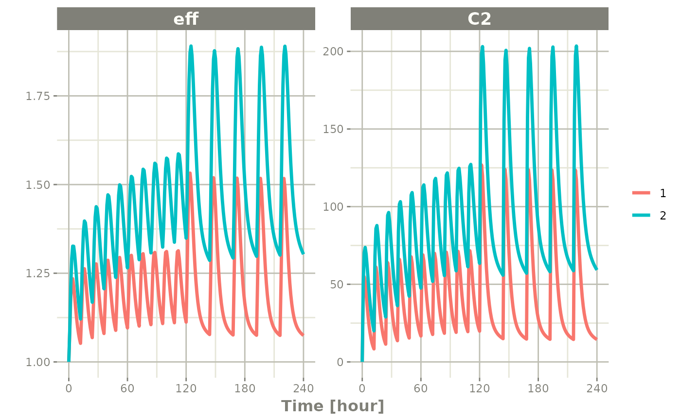 x2 <- rxSolve(mod1, et %>% et(id=1:2), params=data.frame(CL=c(18.6, 7.6)))