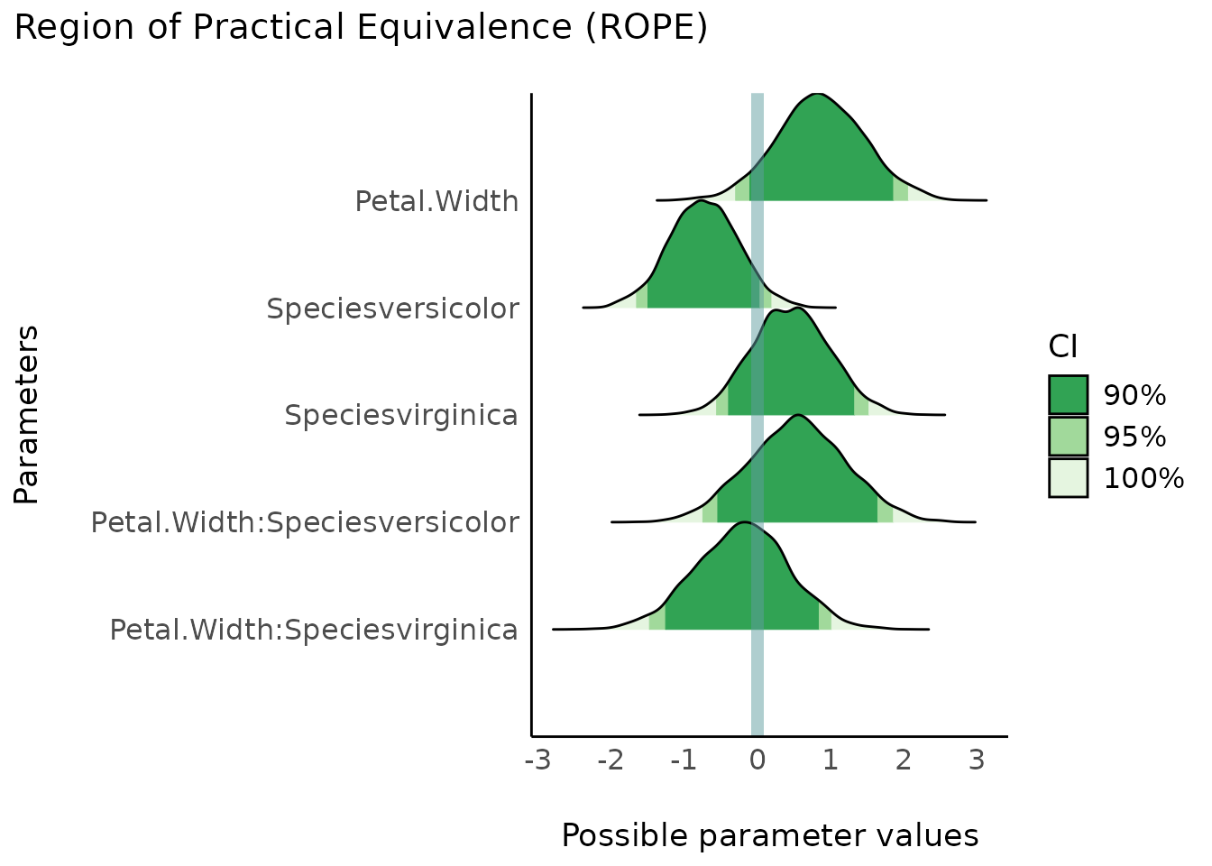 #> Petal.Width:Speciesvirginica | Undecided | 10.74 % | [-1.49, 1.01]