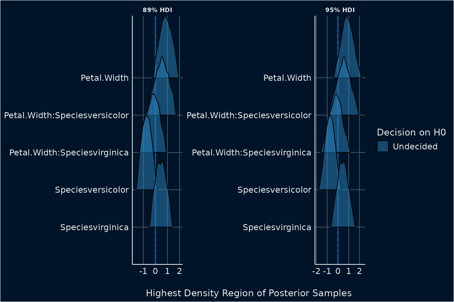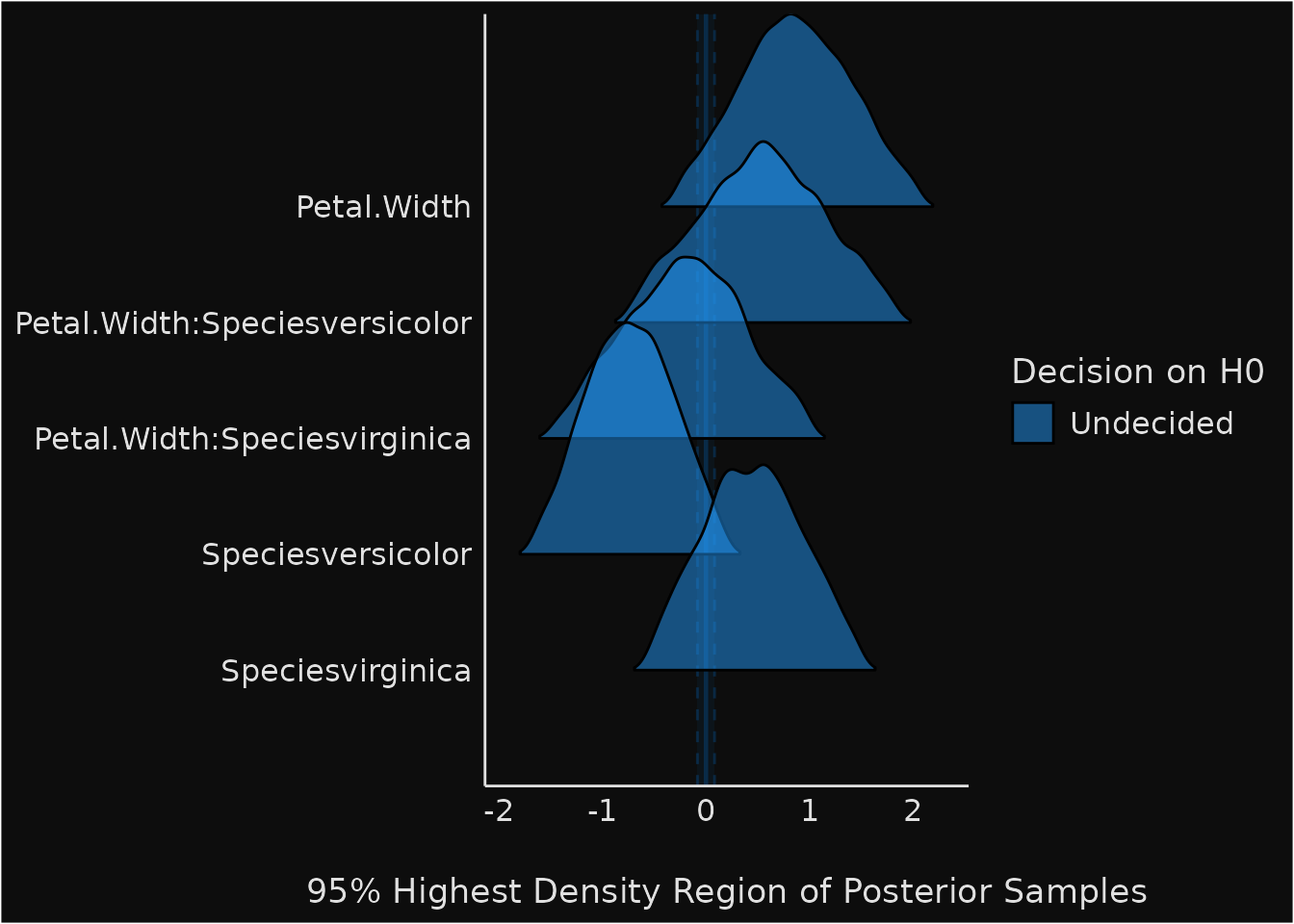 #> Petal.Width:Speciesvirginica | Undecided | 11.46 % | [-1.22, 0.81]