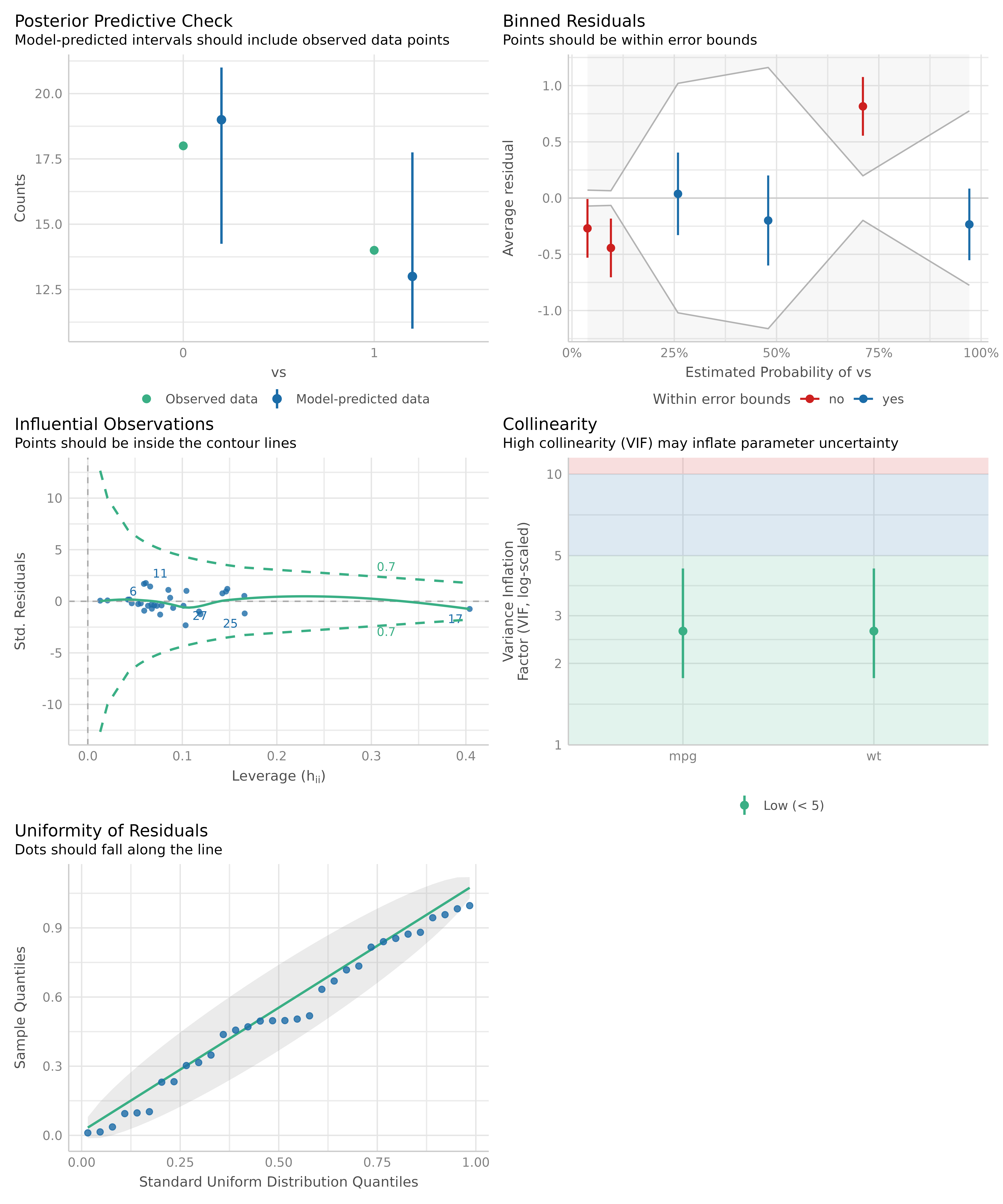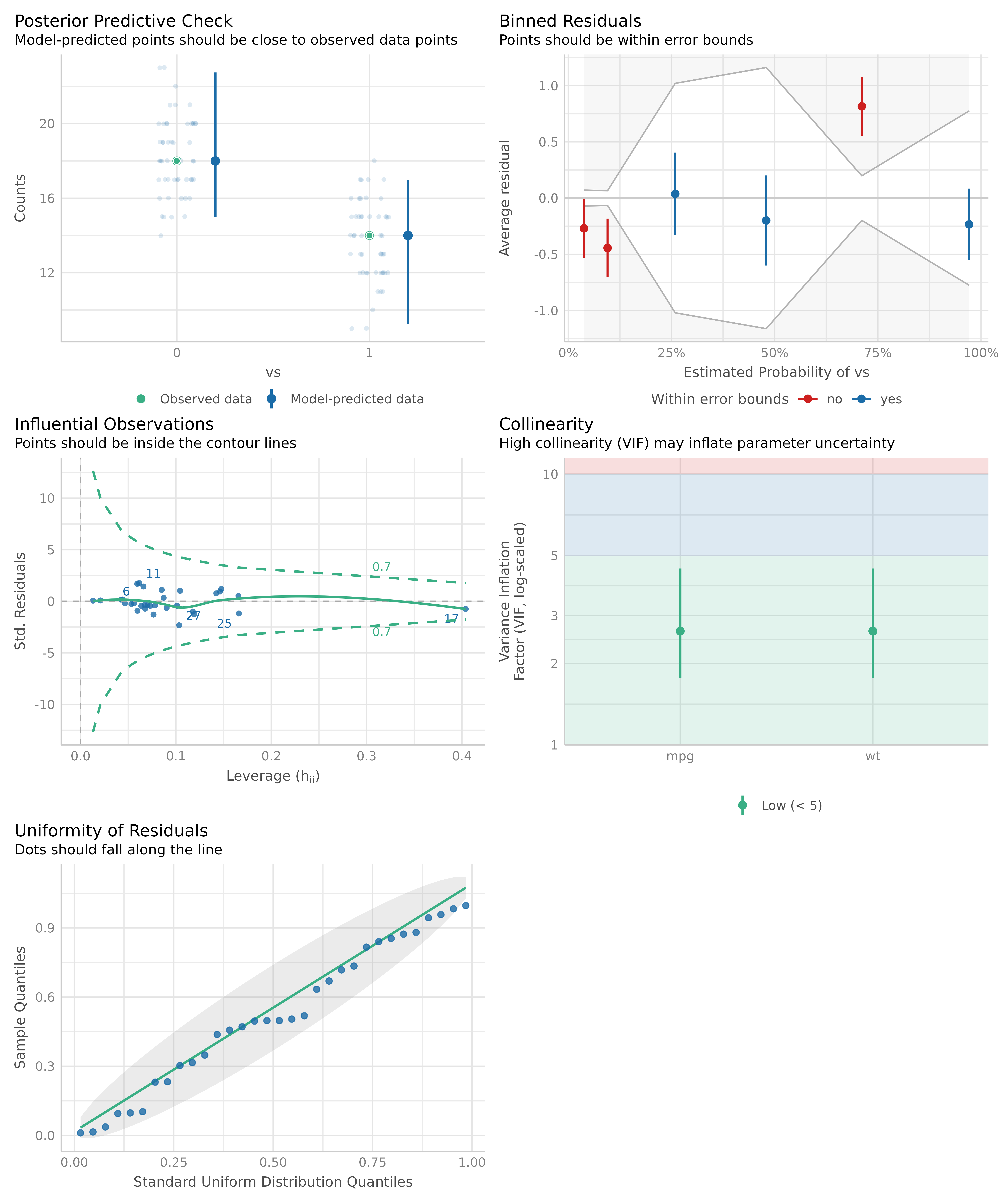 The composition of plots when checking model assumptions depends on the type of the input model. E.g., for logistic regression models, a binned residuals plot is used, while for linear models a plot of homegeneity of variance is shown instead. Models from count data include plots to inspect overdispersion.