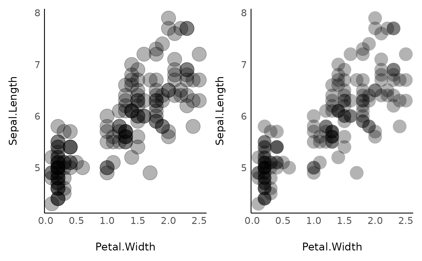 ggplot2::geom_point(),ggplot2::geom_jitter(),ggplot2::geom_pointrange(), orggplot2::geom_count().- stroke