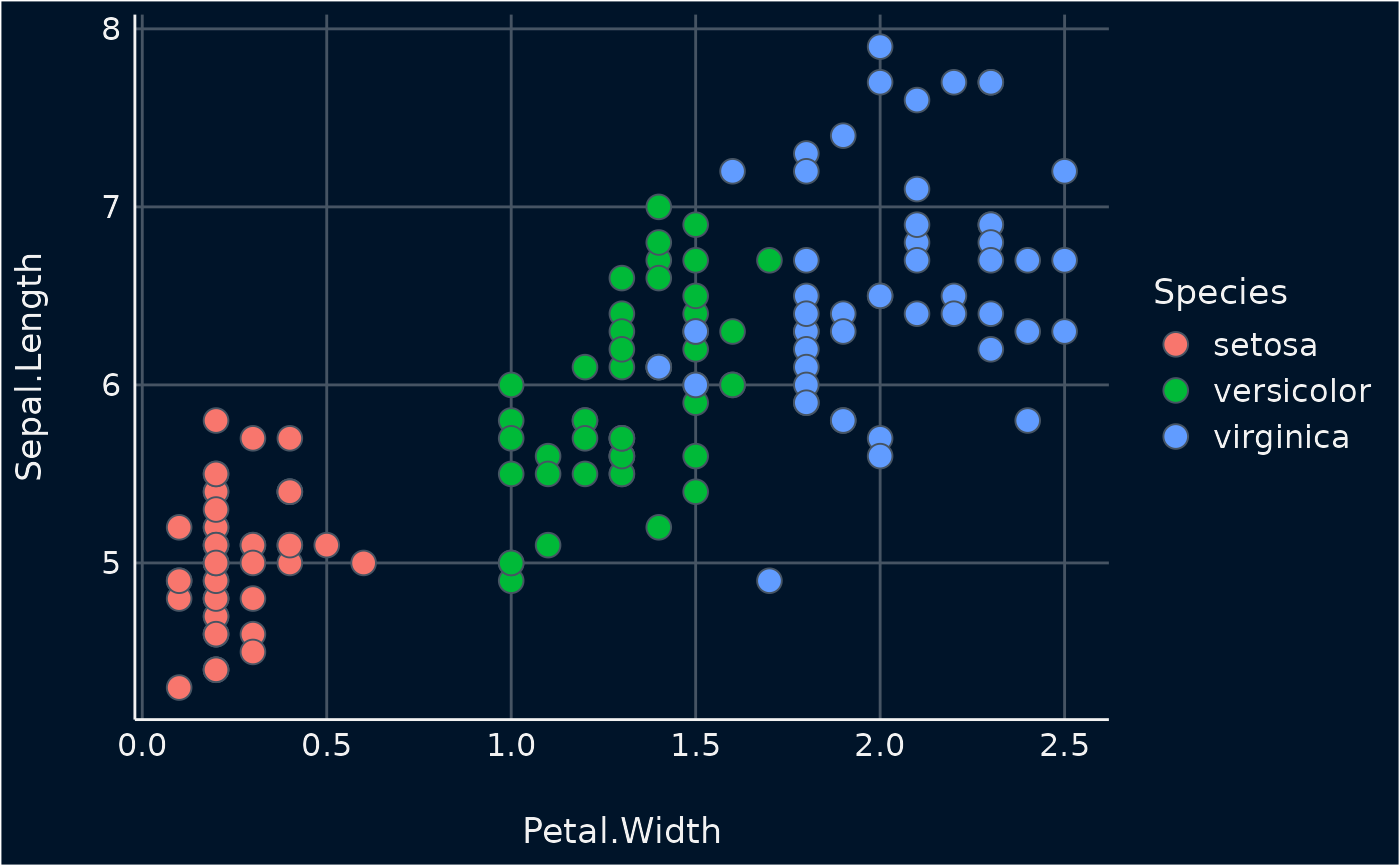 ggplot(iris, aes(x = Petal.Width, y = Sepal.Length, fill = Species)) +