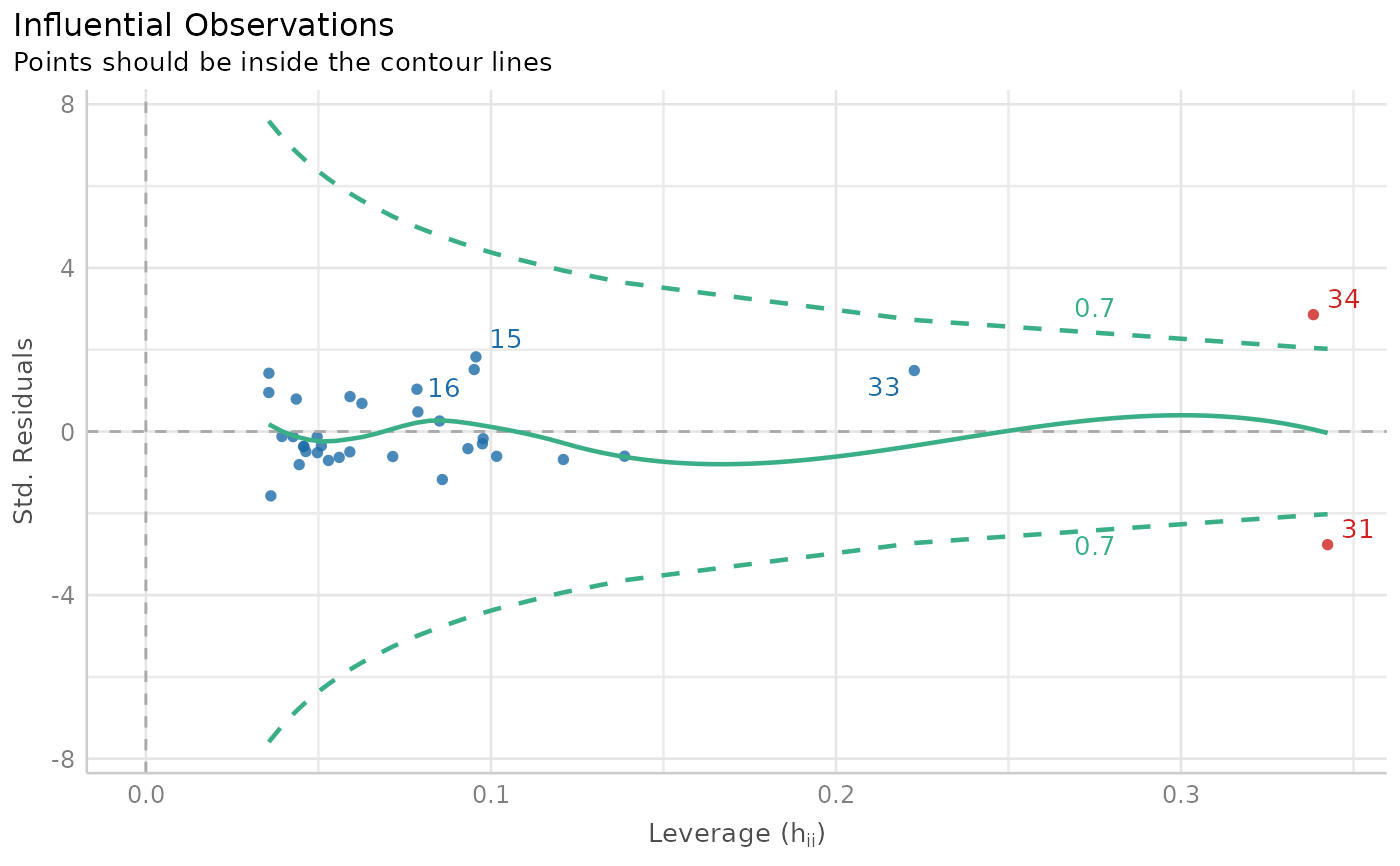 "dots"(default) for a scatterplot of leverage (hat) values versus residuals, with Cook's Distance contours for evaluating influential points, or"bars"for a bar chart of (rescaled) outlier statistic values for each data point. Only used for outlier plots of fitted models; for outlier plots of raw data values,type = "bars"is always used.- show_labels
