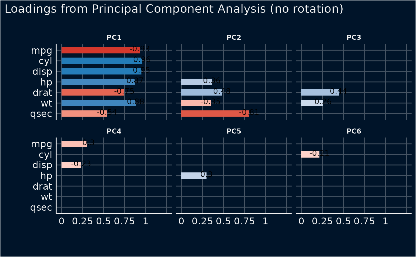 result <- principal_components(mtcars[, 1:7], n = "all", threshold = 0.2)