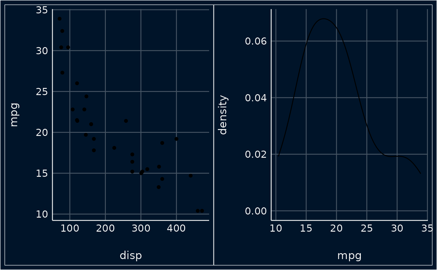 p1 <- ggplot(mtcars, aes(x = disp, y = mpg)) +
