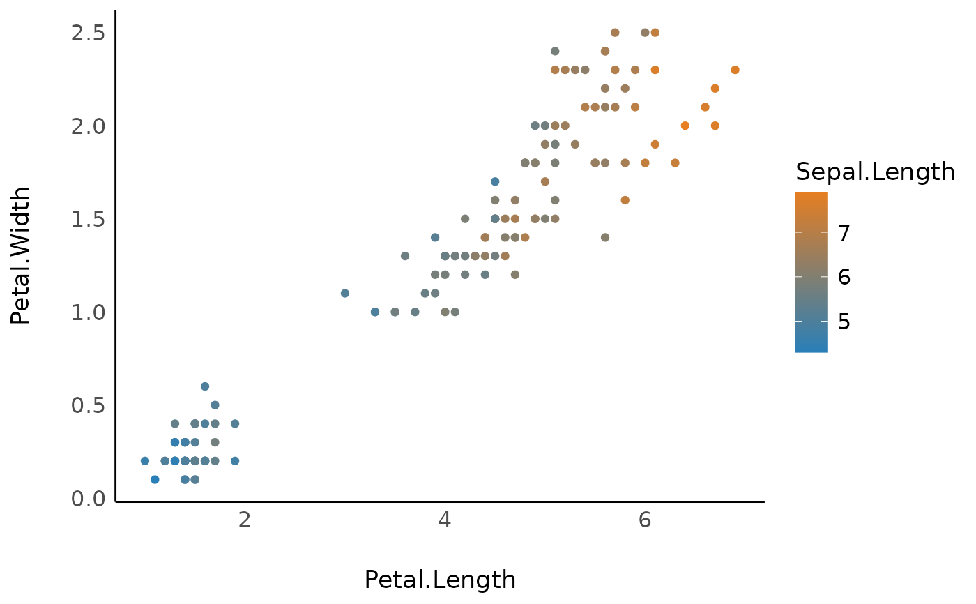 ggplot(iris, aes(x = Petal.Length, y = Petal.Width, color = Sepal.Length)) +