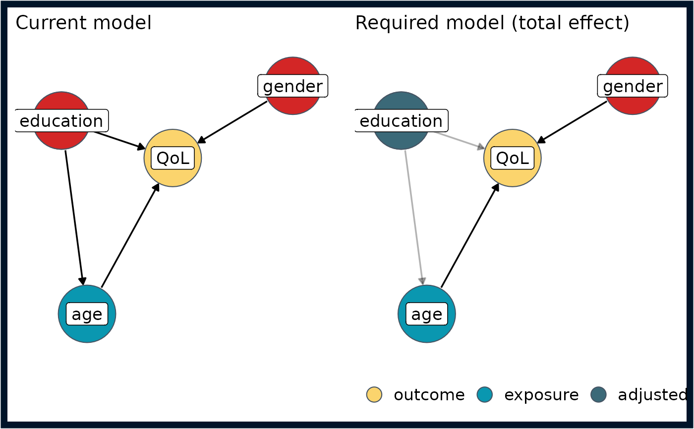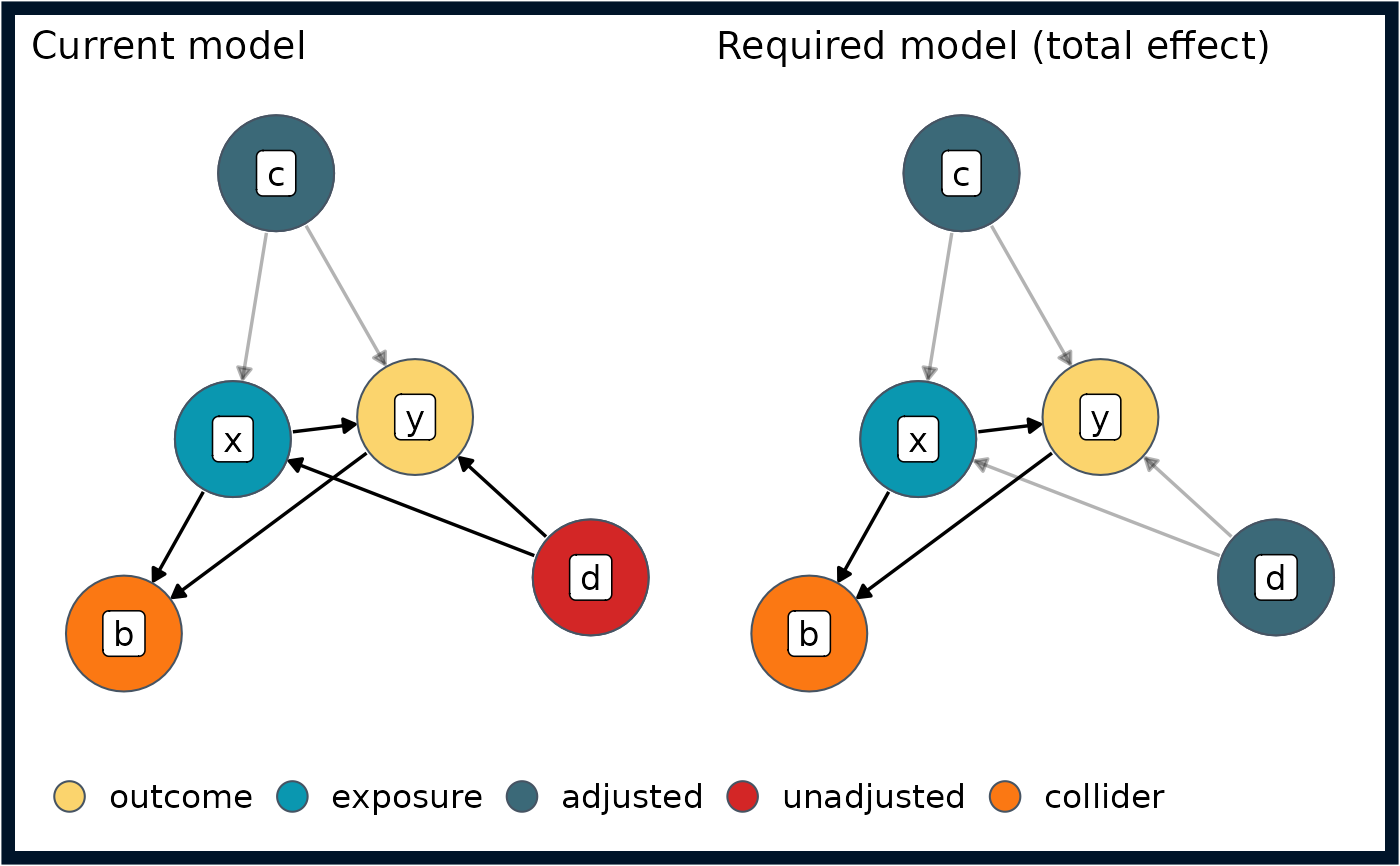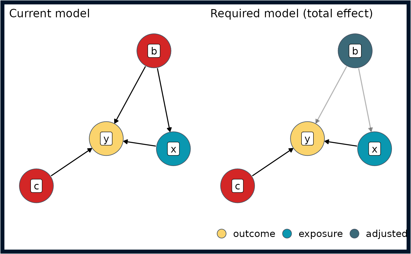 #> To estimate the direct and total effect, at least adjust for `b`. Currently, the model does not adjust for any variables.