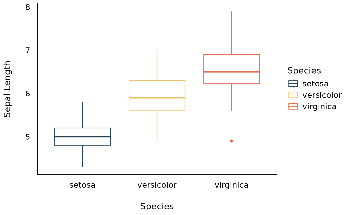 ggplot(iris, aes(x = Species, y = Sepal.Length, color = Species)) +