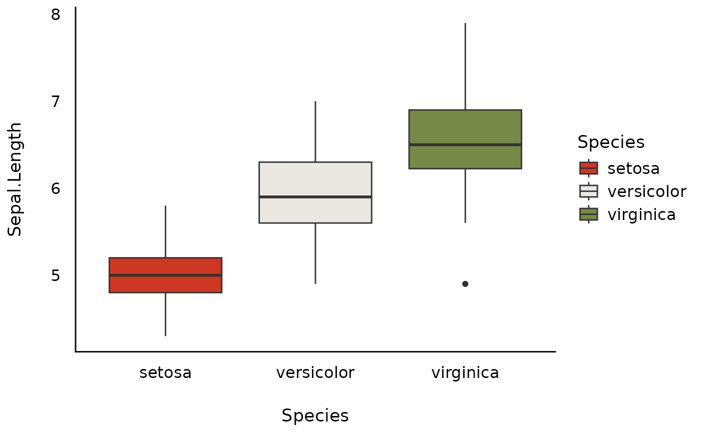ggplot(iris, aes(x = Species, y = Sepal.Length, fill = Species)) +