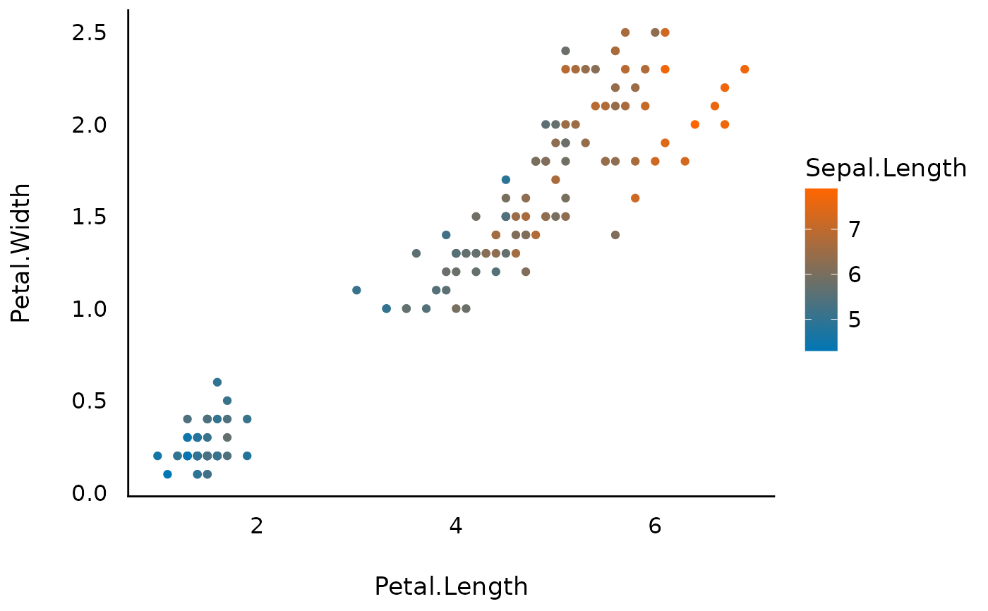 ggplot(iris, aes(x = Petal.Length, y = Petal.Width, color = Sepal.Length)) +