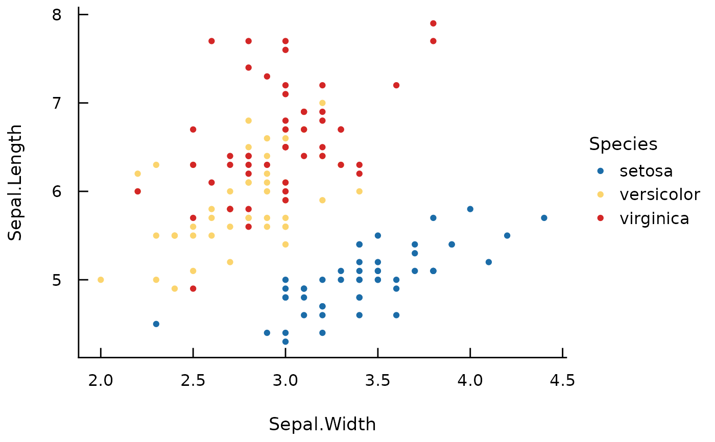 ggplot(iris, aes(x = Sepal.Width, y = Sepal.Length, color = Species)) +