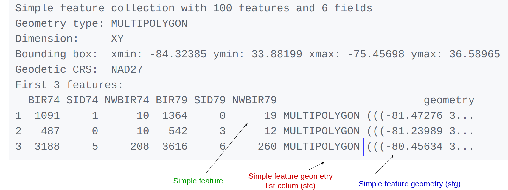 attributes and feature geometries, which containssfc, the list-column with the geometries for each