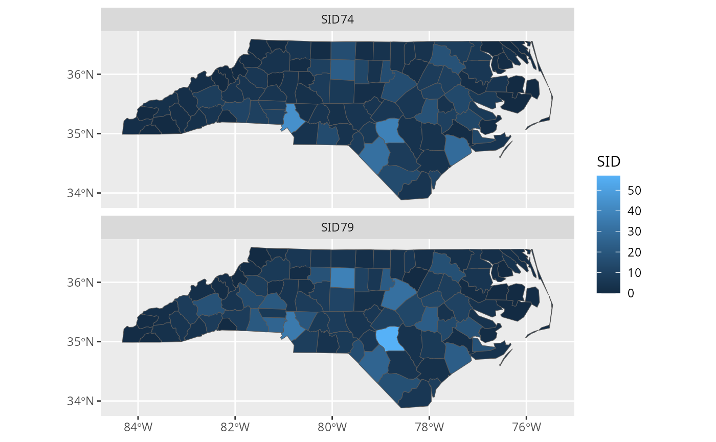 nc2 <- nc %>% select(SID74, SID79, geom) %>% gather(VAR, SID, -geom)