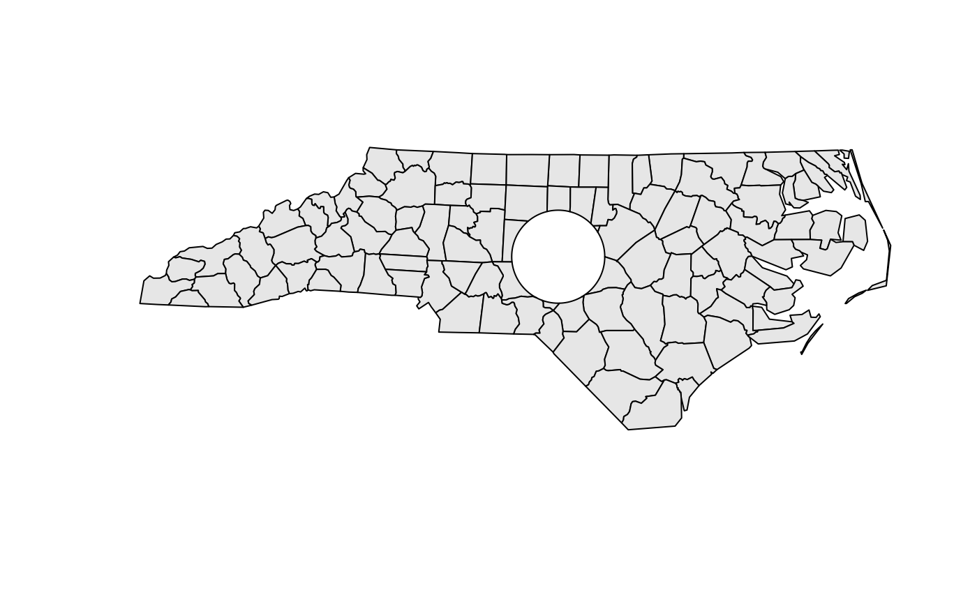 b = st_buffer(st_centroid(st_union(nc)), units::set_units(50, km)) # shoot a hole in nc: