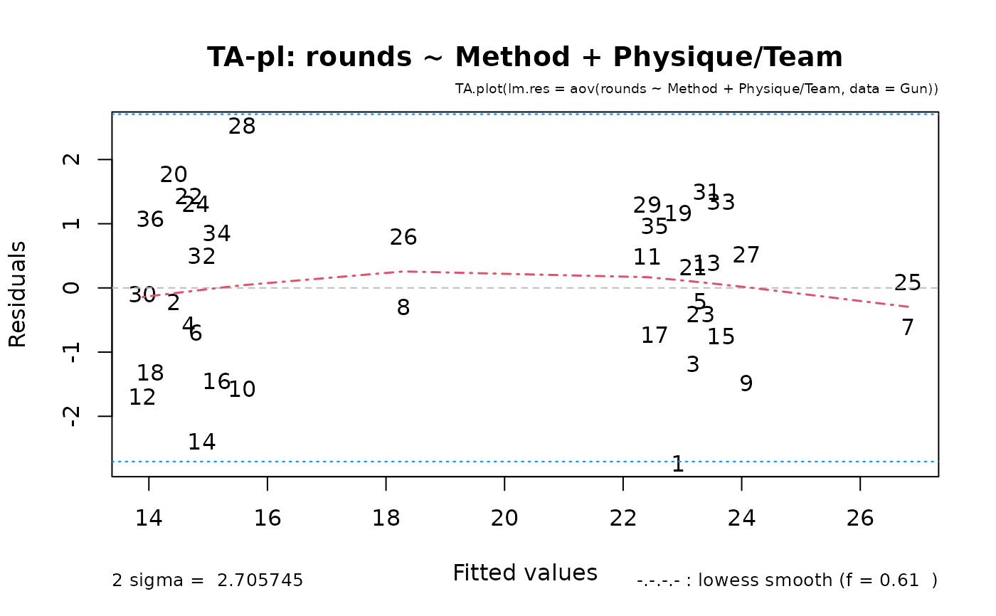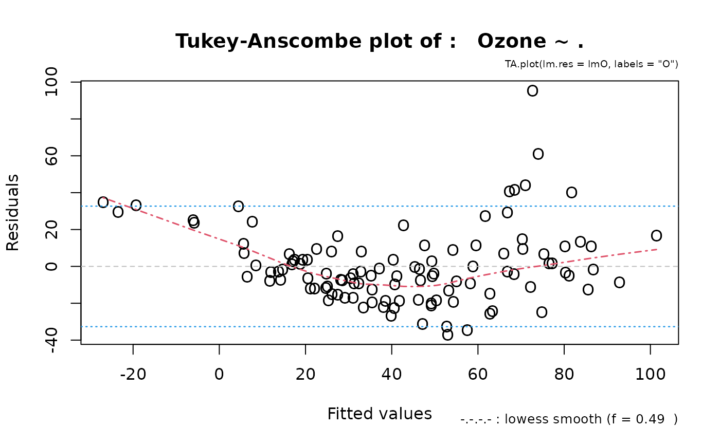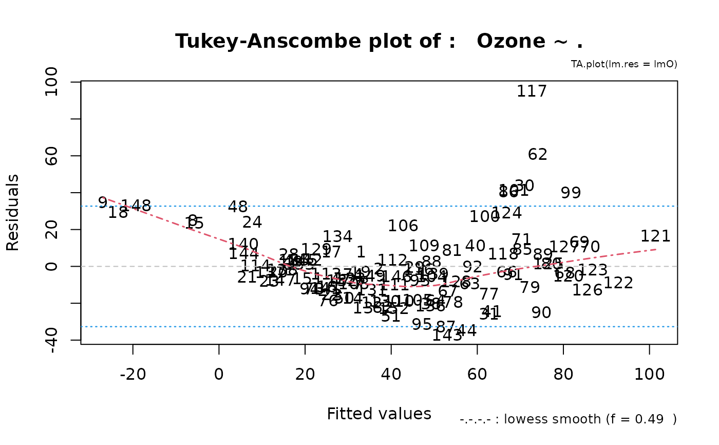 TA.plot.RdFrom a linear (or glm) model fitted, produce the so-called Tukey-Anscombe plot. Useful (optional) additions include: 0-line, lowess smooth, 2sigma lines, and automatic labeling of observations.