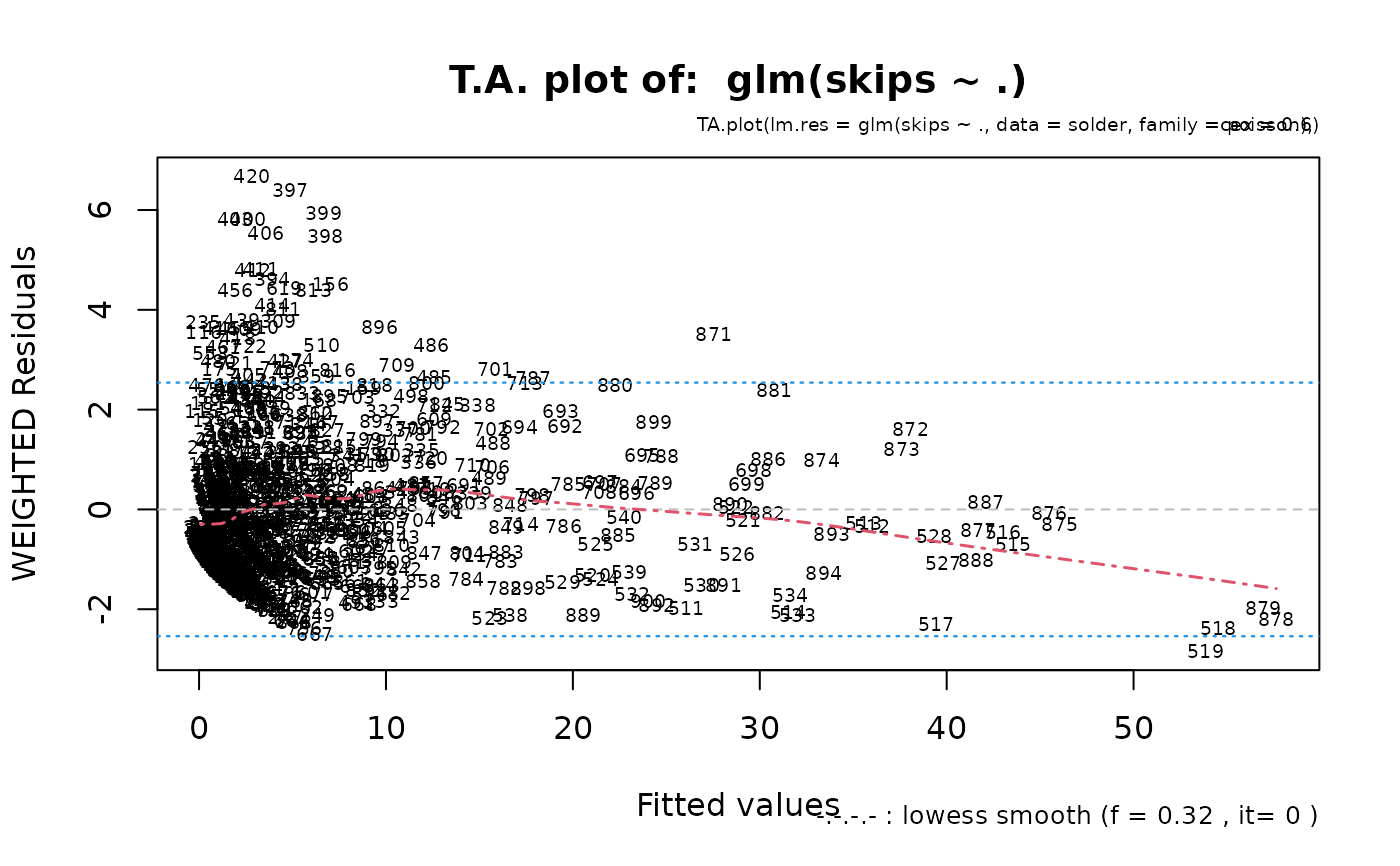 TA.plot(glm(skips ~ ., data = solder, family = poisson), cex= .6)