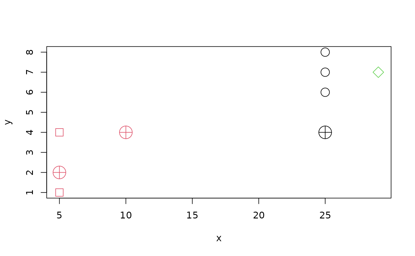 with(d1, points(x+0.5, y, col = cl1P, pch =cl1P))