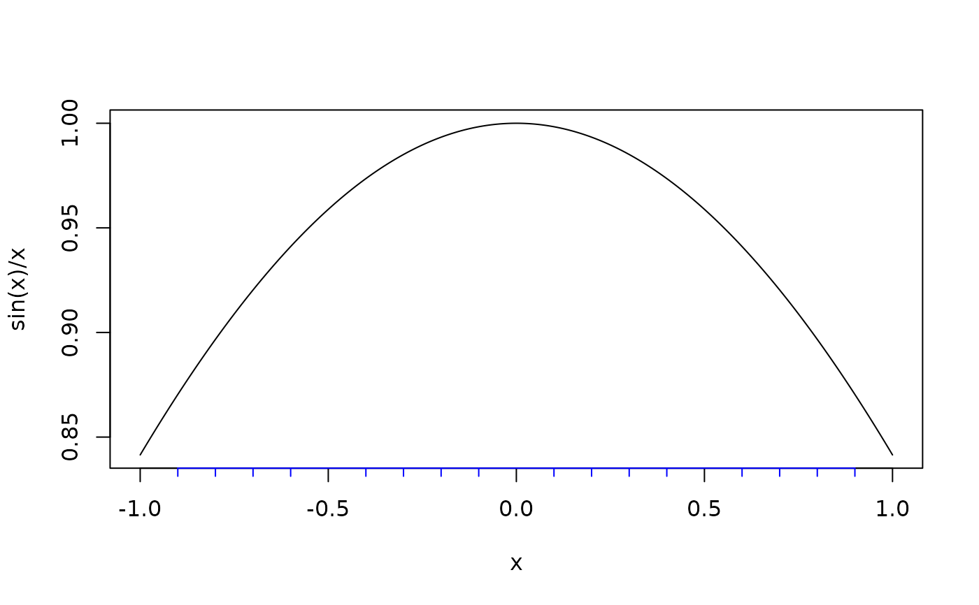 plot(x, sin(x)/x, type = "l", xaxt = "n")