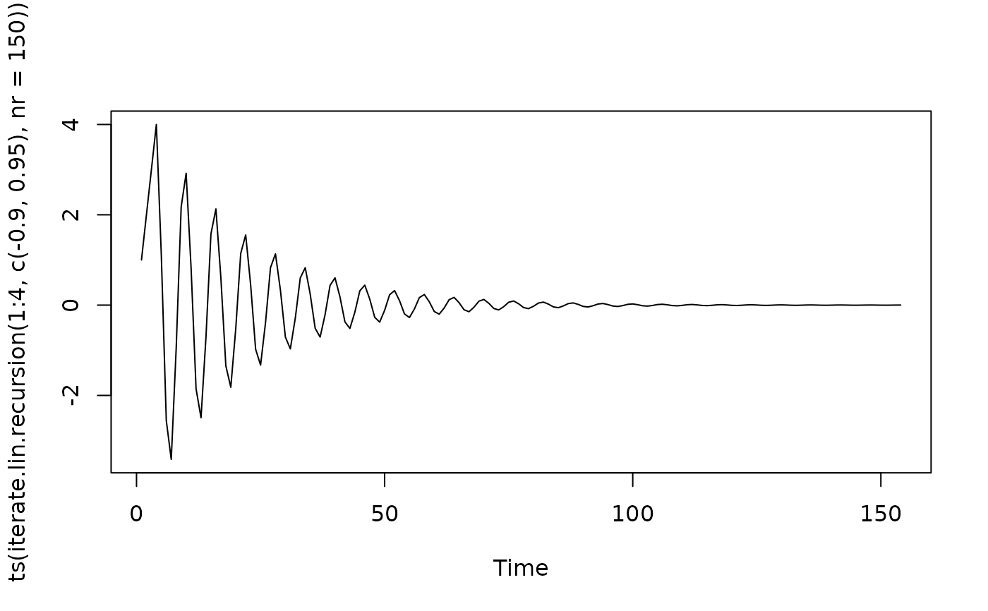 plot(ts(iterate.lin.recursion(1:4, c(-0.9, 0.95), nr=150)))