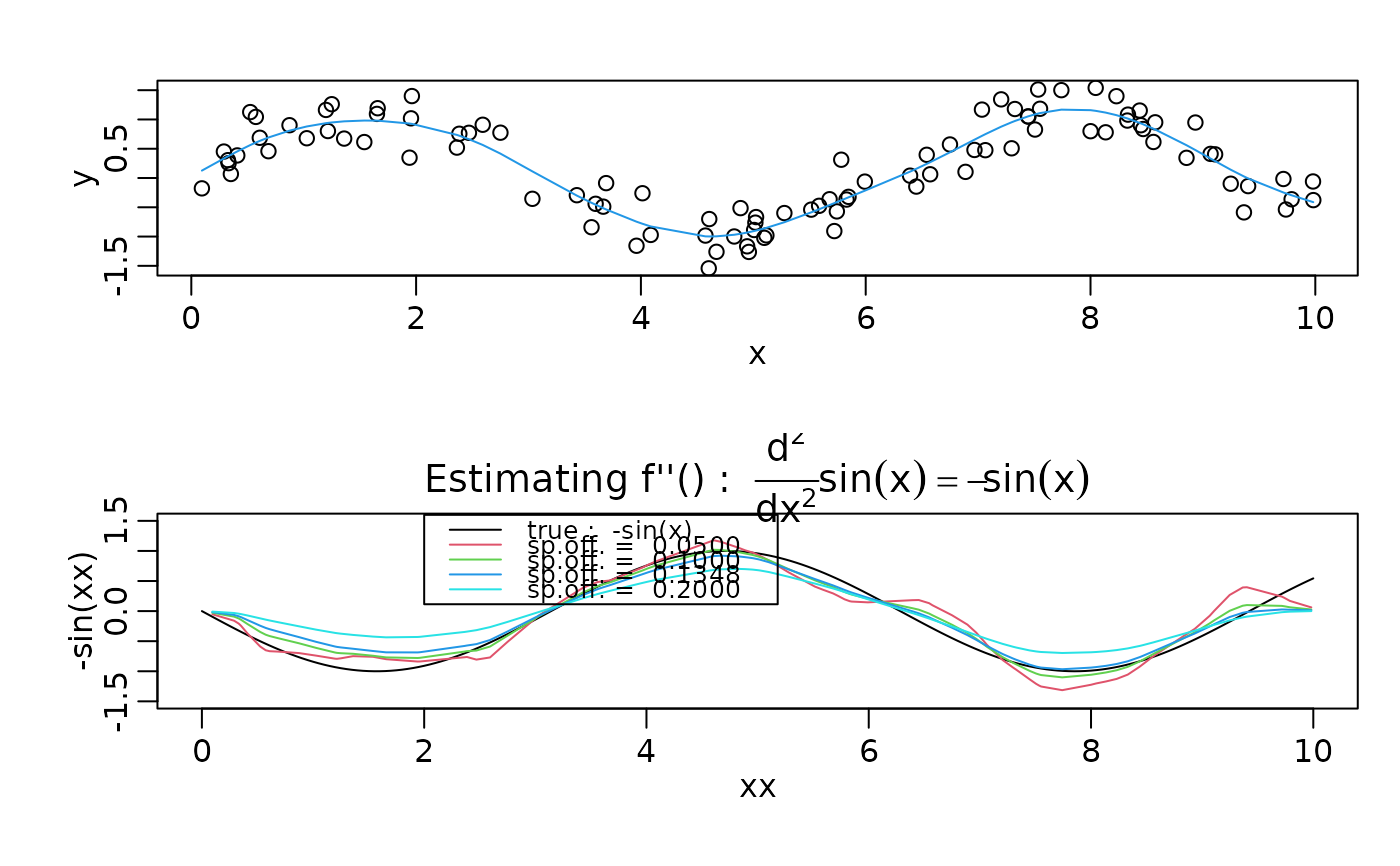legend(2,1.6, c("true :  -sin(x)",paste("sp.off. = ", format(offs))), lwd=1,