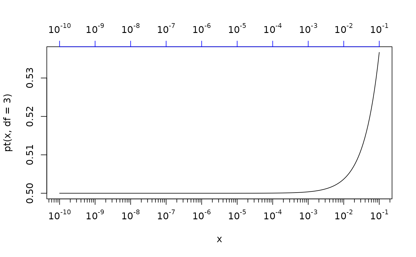 plot(x, pt(x, df=3), type = "l", xaxt = "n", log = "x")