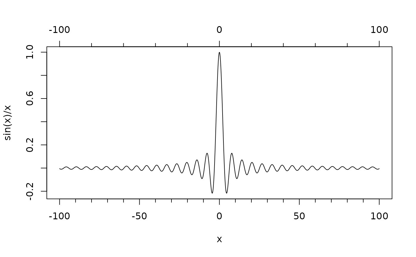 plot(x, sin(x)/x, type = "l", xaxt = "n")